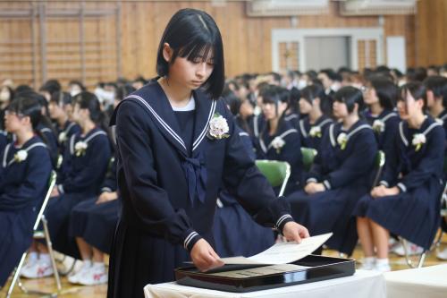 卒業生代表答辞。みんなで過ごしたこの3年間は,宝物です。苦しい時そばで支えてくれた家族にも感謝です。