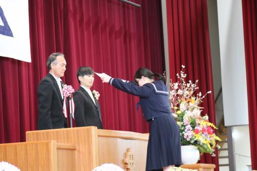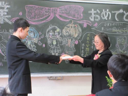 一人ずつ校長先生から卒業証書をいただきました。中学校の課程を修了した証です。