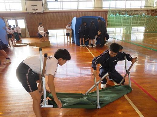 起震車体験、テントの設営、負傷者の運搬などの体験を行いました。