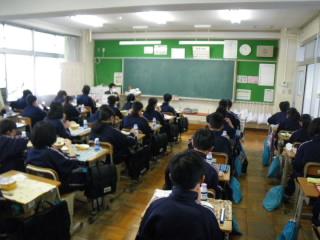 今日から給食が始まりました。本年度も前向き給食で、会食中は会話をしていません。写真は1年生の教室の様子です。