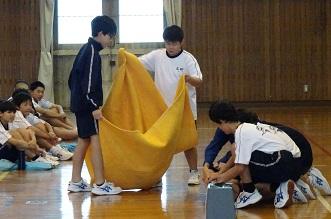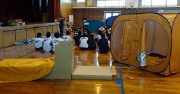 避難所でのテント、ベッド、担架などの組み立てと使い方、防災倉庫の中身の把握、起震車体験などを行いました。