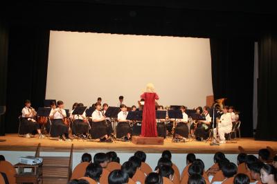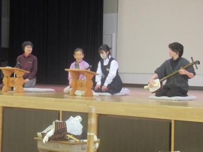 語り手の「太夫(たゆう)」の語りを真剣な眼差しで聴き入っていました。その後、子どもたちも三味線に合わせて、発声を真似していましたが、初めてとは思えないほど上手で驚きました。