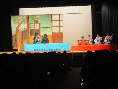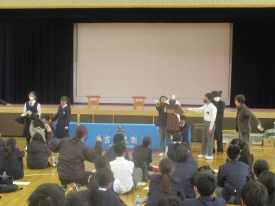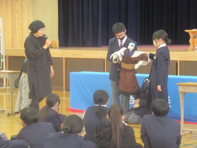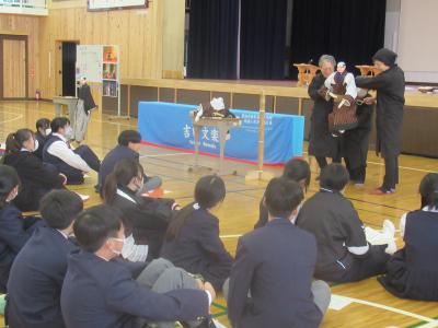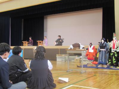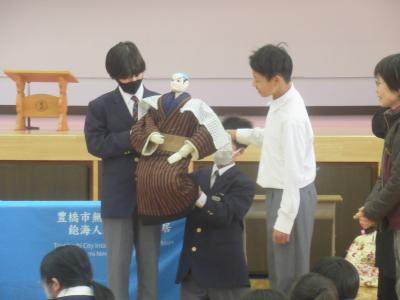 1年生の総合的な学習の時間の授業で、吉田文楽保存会のみなさんを講師にお招きし、人形浄瑠璃体験をしました。