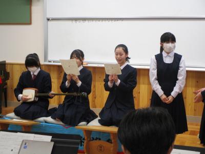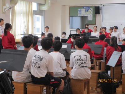 合唱練習の様子をのぞくと、1年生が3年生の合唱を聴き、感想を伝えていました。3年生の歌声の響きと迫力に驚いているようでした。