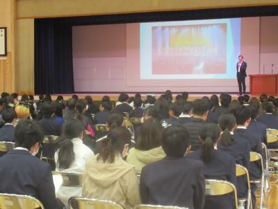 第1部では、「人の生き方に学ぶ会」として天野陽一AMS代表を講師にお招きし、お話を聞きました。「「今を大切に。一生懸命することで、道は開かれる」と、生徒たちに力強いメッセージをいただきました。