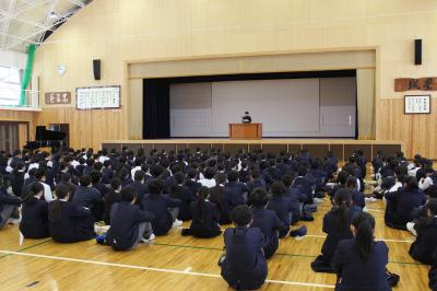 令和8年度前期生徒会の任命式を行いました。生徒会長からは、全生徒に向けてよりよい学校を目指していこうという挨拶がありました。