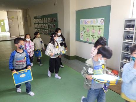 2年生が1年生に教室の名前や場所、どんな部屋なのか、教えてあげました。1年生はしっかり話を聞いて、なかよく探検することができ、とても楽しみました。