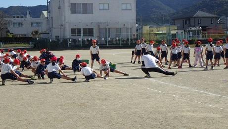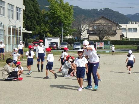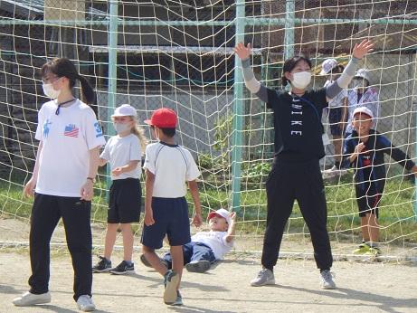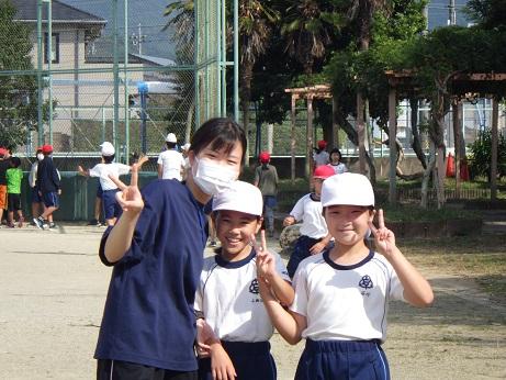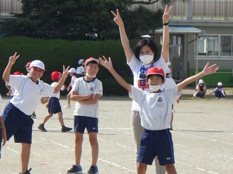今日のお昼休みは青空タイム。子どもも先生も、運動場で思いっきり走って汗を流しました。