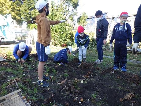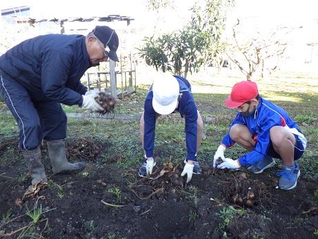 畑の博士と一緒に、春から大切に育ててきた里芋の収穫をしました。初めて里芋がなる様子を見る子もいて、興味深そうに見ていました。また、収穫は、とても力がいる仕事だと知り、農家のかたの大変さを体感することができました。