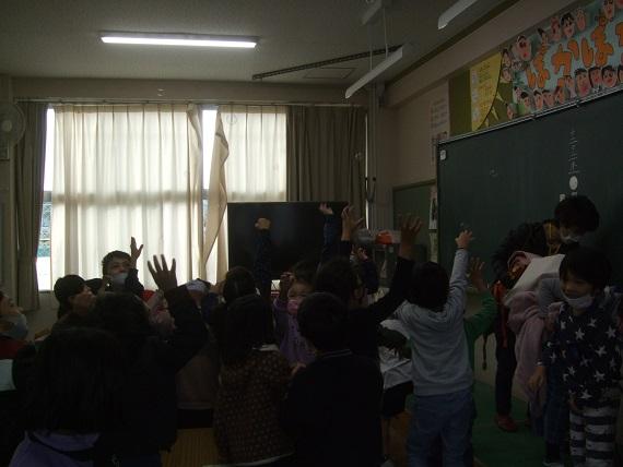 人形劇や子どもたちの背よりも大きい紙芝居,開くと畳より大きい絵本とそのお話に子どもたちは大喜び!とても楽しい会でした。ありがとうございました。