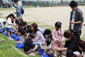 社会科「私たちの生活と食料生産」の学習で、米づくり体験を行います。本日は、田植えに向けて田んぼの草とりを行いました。暑い中、おいしいお米が育つよう、一生懸命草をとりました。