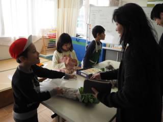 なかよし学級が収穫した野菜をなかよしマーケットで販売しました。お客さんの先生方を相手にたくさんの野菜を売ることができました。