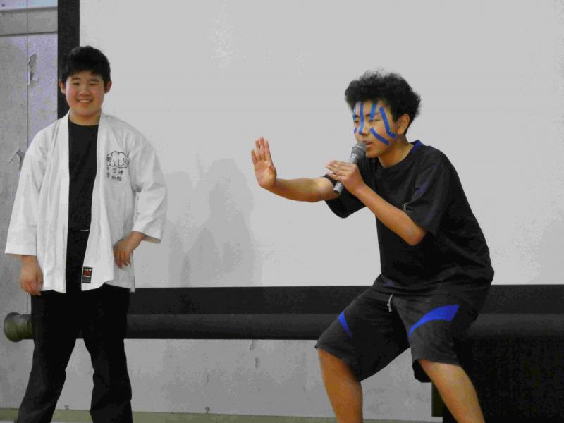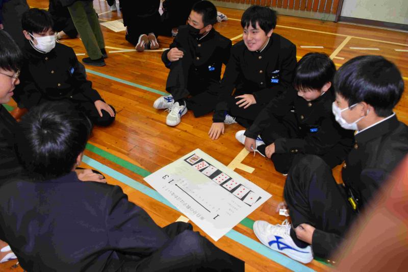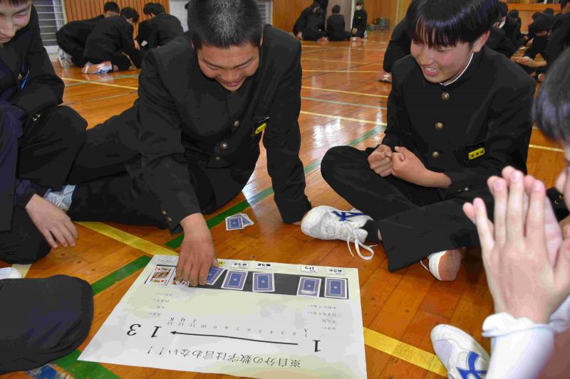 生徒会の企画で、体育館にて生徒集会を行い、2学年での交流を深めました。「ito」というゲームで、お題に対して順位付けをし、もち札のトランプの数字を班のメンバーに見せないようにしながら、大きい順に並べていきます。例えば、「おにぎりの具で人気な順」。K(キング13)を持っている人は、一番人気そうなツナマヨを提案し、一番大きい数のところにカードを伏せておきます。答え合わせで、カードの数字が順になっていれば成功です。カードをめくるたびに、歓声やため息が漏れ、盛り上がりました。