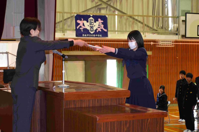 式辞では、三年生を送る会や卒業式を支え、温かく卒業生を送り出してくれたことへの感謝と、「石巻中学校、石巻中生のよさとは?」という話がありました。よさは大切に引き継ぎつつ、新年度自分自身はもちろん、学校、学年、学級を現状維持でよしとせず、少しでも成長できるような目標を立て、皆で一緒に頑張っていこうということばでR7年度を締めくくりました。