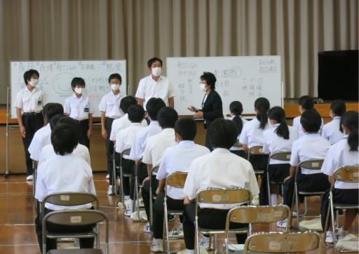 多くの人が生活する学校という場所では、ルールを守ることの大切さを、自分たちの意見交換で高めることができたと感じました。多くの生徒が積極的に発表ができ、とても頼もしく感じました。特に2年生の発表者が多く、中学校生活1年間の成長の差を感じた時間にもなりました。