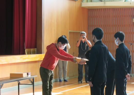 同窓会長 鳥居 宣行 様 からは、同窓会入会記念品と同窓会入会へのお祝いの言葉をいただきました。PTA会長 宮内 祥徳 様からは、卒業記念品をいただきました。卒業生の動きも大変立派で、天候にも恵まれる明日の卒業式が素晴らしいものになることを確信しました。
