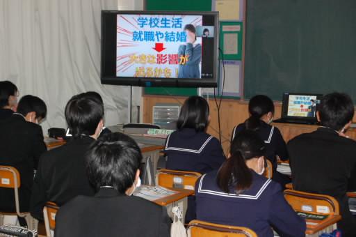 生徒たちは、教室でテレビ画面を見ながら、SNSの利用に伴う危険などについて学ぶことができました。