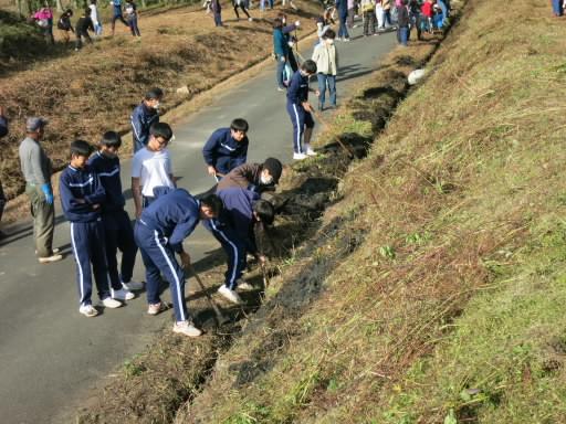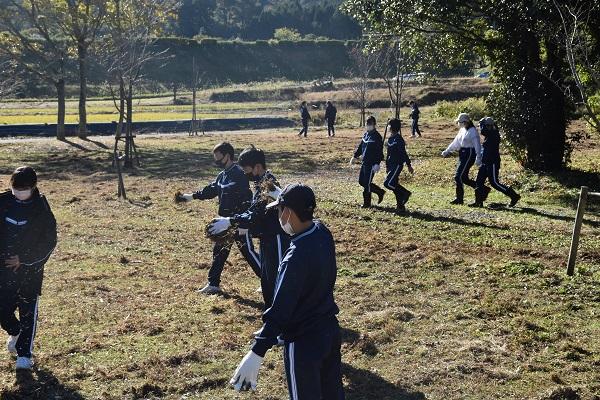 11月29日に石巻校区の自治会のからの依頼を受けて、三ツ口池周辺の広場の整備活動を、校区自治会や小学校の方と一緒に行いました。お休みの日曜日でしたが、多くの生徒の皆さんがボランティアとして参加してくれました。