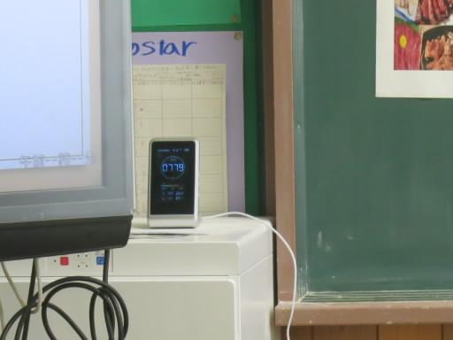 新型コロナウイルスへの対応として、教室の換気状態を、二酸化炭素濃度を測定することでチェックしています。どの教室も厚生労働省の目安の1000ppm未満となっています。