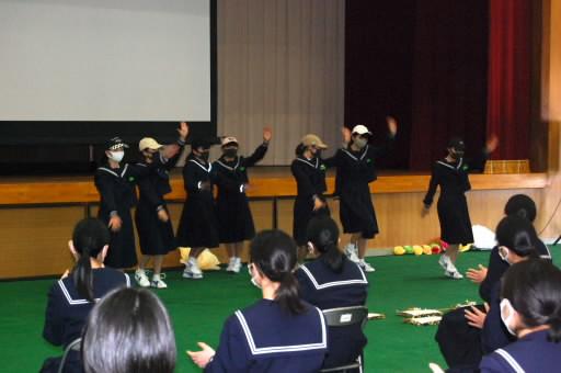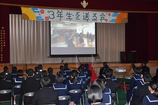 3月25日に三年生を送る会が行われました。全校が体育館に入ることができないため、在校生はパフォーマンスを行う生徒のみが体育館の3年生の前で演技をしました。他の生徒は映像で出演し、当日は教室で体育館の様子を中継で見ました。