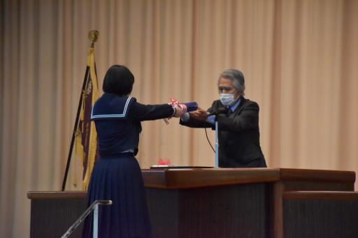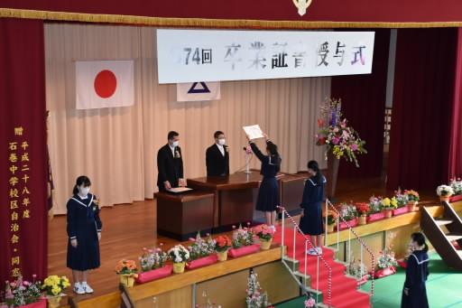 3月3日に第74回卒業証書授与式が行われました。感染拡大防止のため、参加者を卒業生、保護者一世帯1名、来賓代表1名、在校生代表1名、職員も一部のみに絞り、席と席の間隔を開けて行われました。