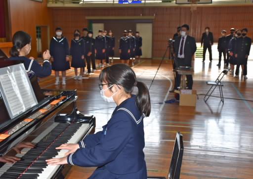3月3日(金)の1、2時間目に、7日の卒業証書授与式の予行練習を実施しました。当日は、座席間隔の関係で、会場内の在校生は、代表で2年生のみとなります。予行は、保護者席に1年生が着席し、本年度になって初めて、体育館に全校生徒が集合しました。起立や礼などの基本動作などであっても、全校生徒が一斉に動くと、感無量でした。
