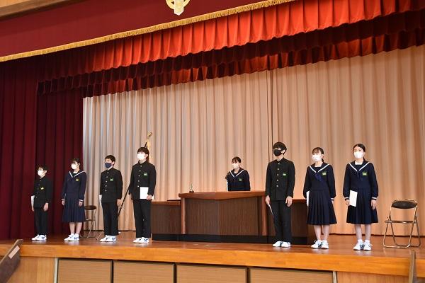 本日、令和4年度の修了式を行いました。式に先立って、表彰、令和5年度生徒会役員認証式を行い、修了式の後はお別れの挨拶と生徒指導についての連絡がありました。