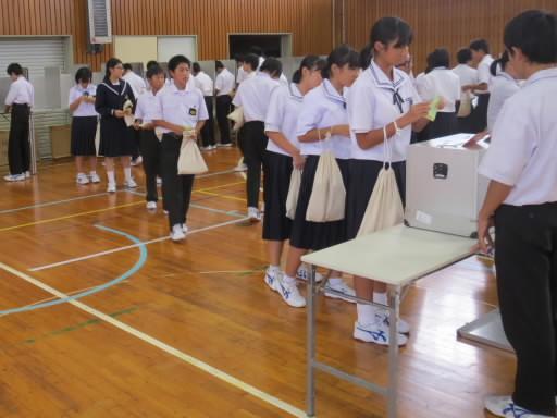 立会演説会に続いて投票を行いました。今年も本物の記名台と投票箱を使って行われました。演説を聞く態度はとても立派でした。結果発表は明日です。