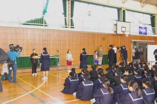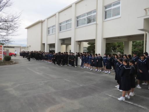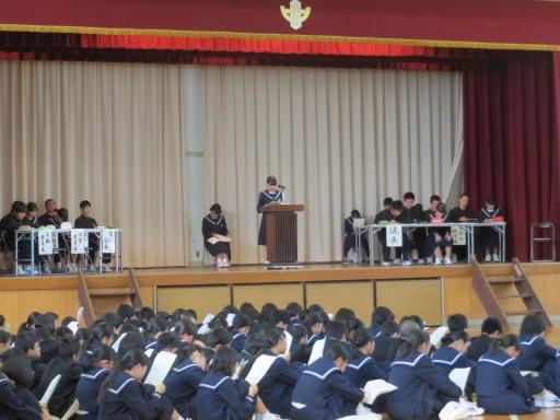1,2年生の定期テストが終了した2月15日の午後に全校集会が行われました。表彰では市のユネスコ協会からのボランティア活動認定証授与や豊橋警察署の無事故ラリーの金賞受賞の格納などが行われました。