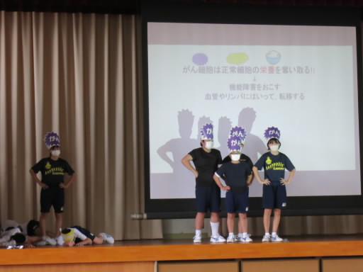 7月16日に「本気で考えよう、健康と命の大切さ ~今から私たちにできること~」というテーマで学校保健委員会が行われました。委員会の中ではがんについての知識を深めるため、保健委員会の人たちが劇を行ってくれました。がんのこと、わかったかな。
