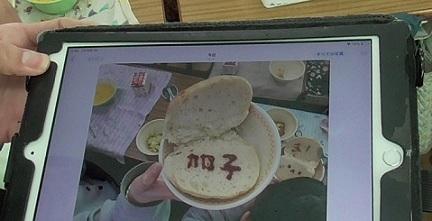 今日の給食は「フィッシュバーガー」でした。私の大好物をどのように楽しんでいるかと教室を回っていたところ、「パンメッセージ」を作ったとのことでした。これまで同様に、昨年度までお世話になった先生のお名前がそこにありました。「元気にやってます」とお世話になった先生に届けたいと願っていました。