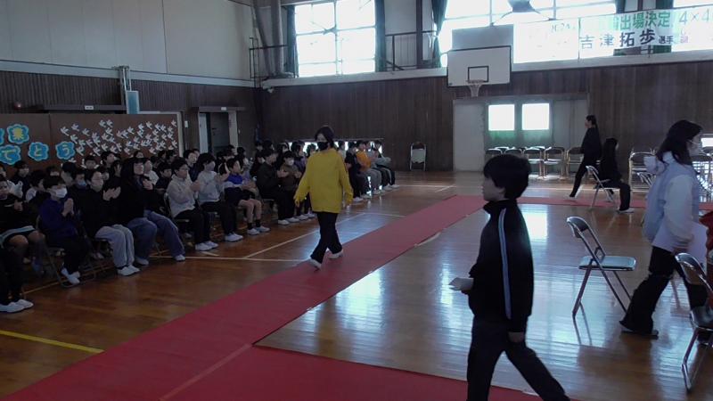 6年生を送る会を開催しました。6年生は1年生が贈ったメダルをつけて入場しました。