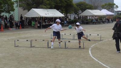 障害物リレーは5年生からスタート。お盆の上にあるボールを落とさないようにハードルを飛び越えるのは難しいですが、高学年ともなると、華麗に飛び越えていきます。