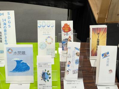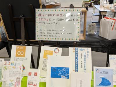 また、1階入口には磯辺小の6年生が中央図書館の出前授業の本を用いた調べ方で学んだことを生かして作成した「SDGs啓発パンフレット」が展示されています。2週間ほど展示されるそうですので、お立ち寄りの際にはぜひご覧ください。