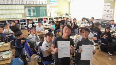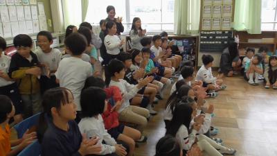 昨日の全校集会では、11月5日に行いました「体育発表会」の、徒競走、競技種目の優勝クラスおよび大玉転がしの表彰を、6年生児童に代表して受けてもらいました。今日は「出前表彰式」として、給食の時間に優勝した学級を訪問しました。