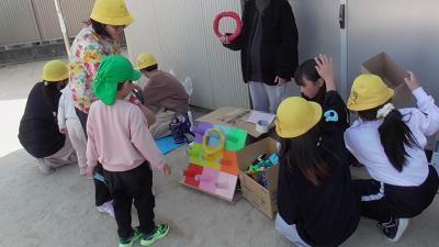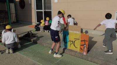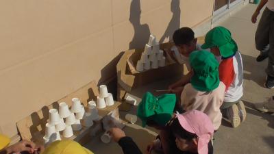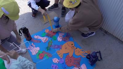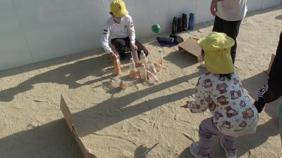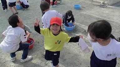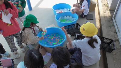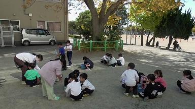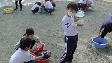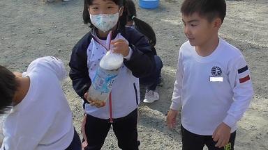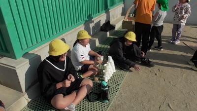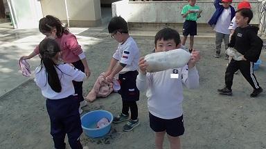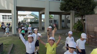 外から楽しそうな笑い声、叫び声が聞こえてきました。外を眺めてみると、磯辺っ子が愛するむくろじの木の下で子どもたちがペットボトルを振っています。