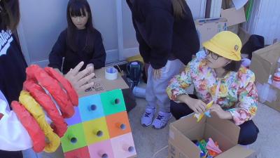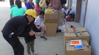 5,6年生のプールから帰ってきて、1年生のなんでもポケットを見に行こうと、図書室に向かう途中に、3年生の虫眼鏡の実験の現場に出会いました。虫眼鏡で光を集めて、段ボールから煙を出そうとしていますが、なかなかうまくいきません。焦点がすぐに動いてしまいがちです。