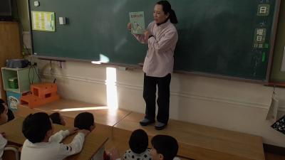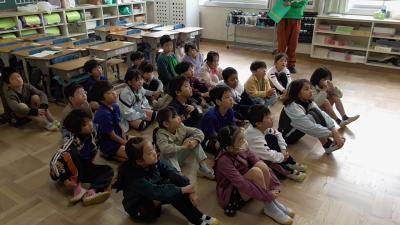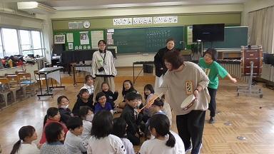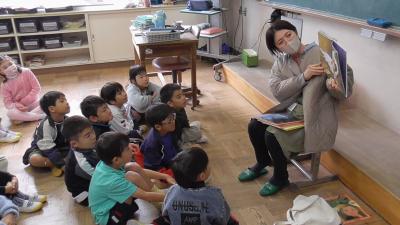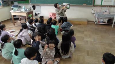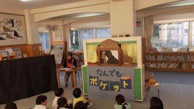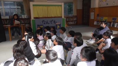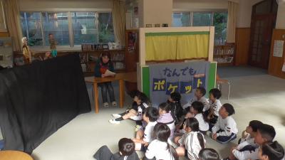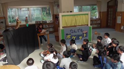 今日は1年生の各クラスで、1時間ずつなんでもポケットが行われました。素話は、魔法のお鍋から出るおかゆがどんどん増えt町中を覆いつくすお話です。以前、別のボランティアさんがお話しされたのをお聞きしたですが、それぞれ語り口に味があって、子どもたちもお話に夢中です。