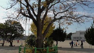 運動場を出るとシンボルツリーのムクロジの木の前を左折します。