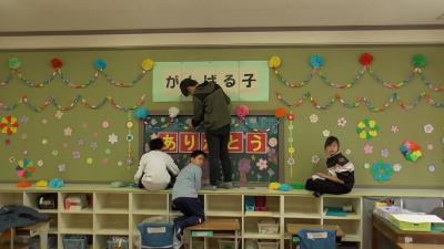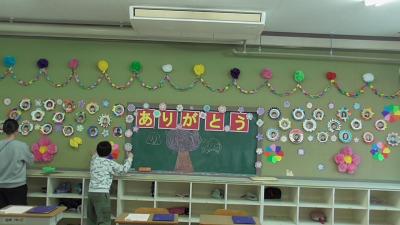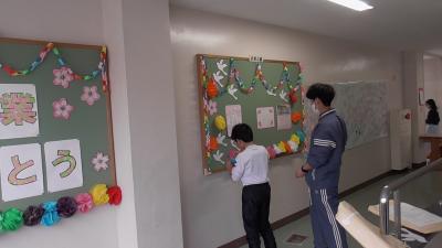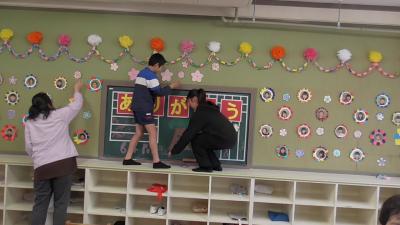 ひまわり学級、6年各学級の教室についても、担当の5年生が飾りつけをしてくれました。全面黒板は明日までのお楽しみにしておいてください。力作ばかりでした。
