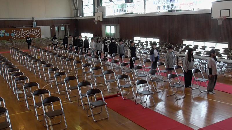 卒業式本番のちょうど一週間前にあたる3月12日(木)に、sツ業式の予行練習を行いました。卒業式に来校される保護者のみなさま、来賓のみなさまの枯れましては、写真や動画参考に、卒業生の座席、ステージ前の立ち位置、入退場の動きなどをご確認いただければ幸いです。