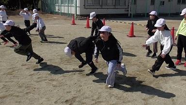続いては「進化じゃんけんでした。たまご→かに→とり→ゴリラ→人間です。じゃんけんに勝つ続けると人間までたどり着き、負けると一歩後退です。水前寺清子のように3歩進んで、2歩下がるを繰り返した子も多くいましたが、半分くらいの子が人間までたどり着いたようです。カニがかわいいです。