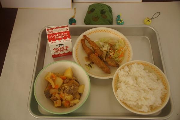 今日の給食は、アジフライ、五目きんぴら、ごはん、牛乳に、そえやさいのキャベツでした。