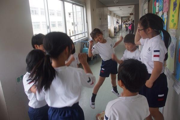 ペア遊びを室内で行う子も、場所を広々と使うことができたようです。トランプ、ウノ、ボール回しに、「ワードウルフ」など、遊びも多種多様です。渡り廊下を使って、「だるまさんがころんだ」を行うグループもいました。運動場が元通り広く使えるようになって、磯辺っ子はますます元気に活動してくれています。
