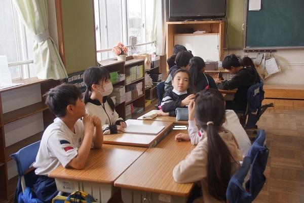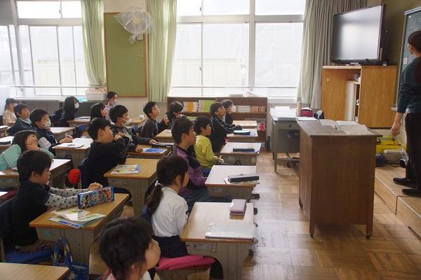 「だんまりこおろぎ」の絵本を見ると子どもたちは、「はらぺこあおむし」と同じ人が作った絵本だとつぶやき始めます。さすが本に慣れ親しんだ磯辺小の子どもたちでした。最後に、きれいなコオロギの音がすると子どもたちも不思議がっていました。光センサーで音が鳴る絵本を裏で開いていた種明かしをしていただきました。