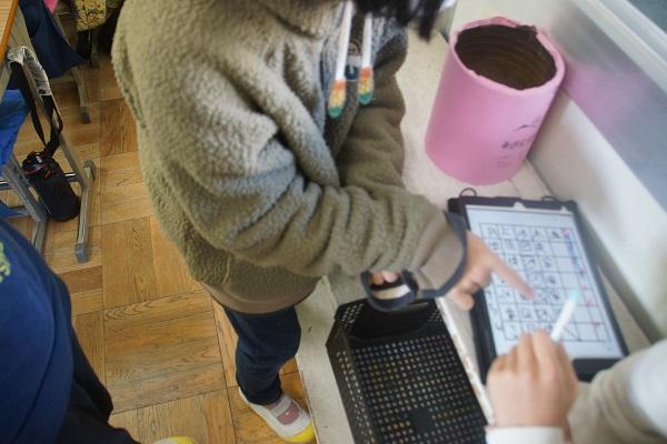 点字では、6つの点の凹凸で文字を伝達する方法ですが、六点がすべて山となっている文字は「め」で、それが漢字の「目」に由来すると教えていただき、勉強になりました。駅や公共施設で目にする点字のルールに触れることができ、子どもたちは、「わかる」喜び、楽しさを味わっているようでした。