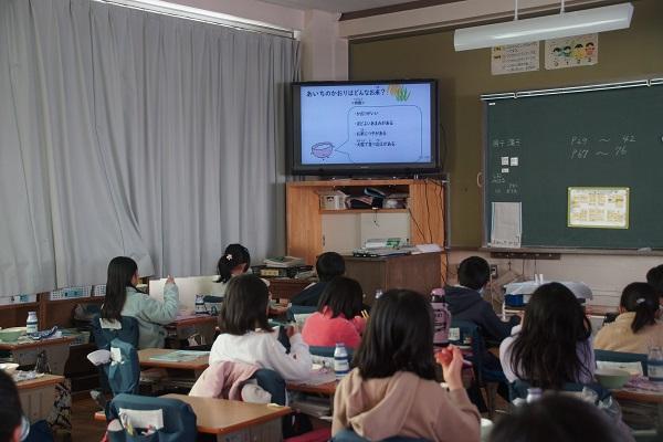 また、先日入賞を披露した「市内小学校詩作文コンクール 優秀」に輝いた6年生児童2名に、入賞作品を朗読してもらいました。日常生活や体験を通して、気づいたこと、学んだことを素直に表現できていました。教室で朗読を聞いていた児童にとっても、詩や作文を書くときの話題の見つけ方や表現方法を学んだり、将来の夢を見つけるヒントを得たりしたのではないかと思います。