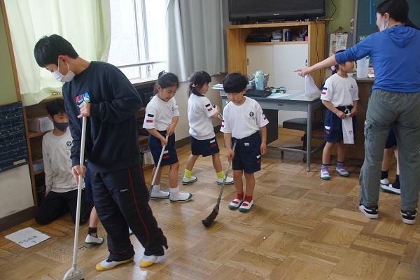本日の「のびるんdeスクール」の講座は、高学年が小動物とのふれあい体験で、低学年は走り方教室を行っていました。