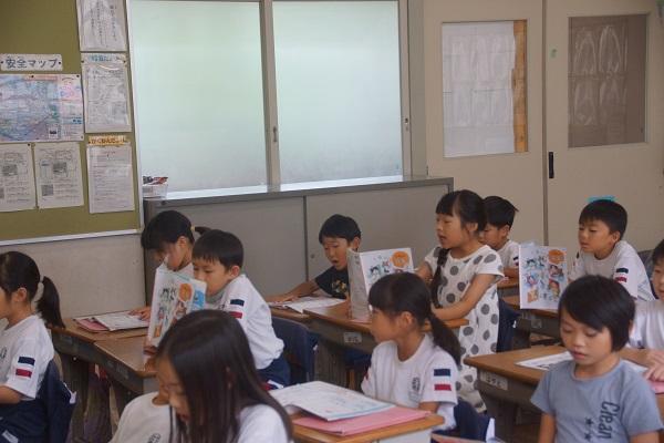 1年生では、国語で学んだ「サラダで元気」のロールプレイをしていました。しっかりセリフが覚えられており、家庭でご協力いただいたおんどくの成果が感じられました。
