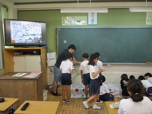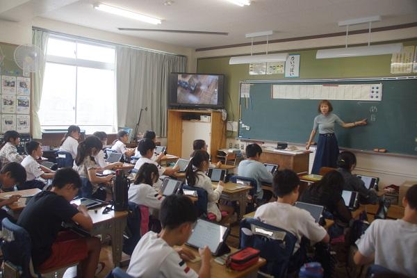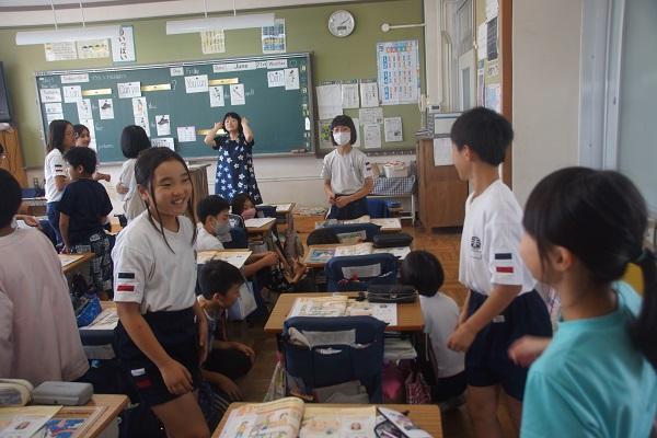 英語活動のスクールアシスタントさんが出す3つのヒントから、その動物をあてるゲームをしていました。語学習得で大切にしたい推測をして、それを躊躇なく、口に出せる授業の雰囲気がとても素晴らしいと感じました。担任の先生が黒板に書くヒントや掲示物も子どもたちの思考をサポートしてくれています。